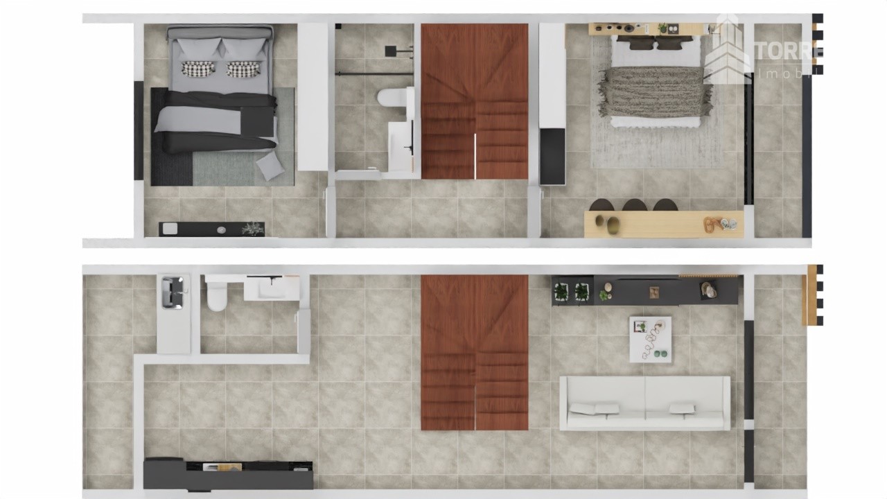 Piso térreo: Dois Dormitórios, Sala de jantar e estar integradas, cozinha, lavanderia, Banheiro, varanda com churrasqueira