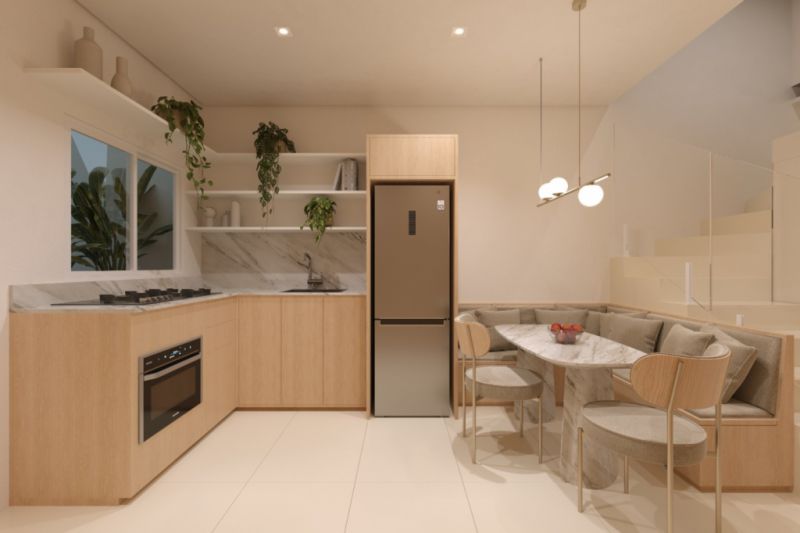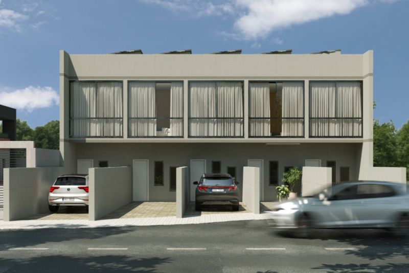 Nos acabamentos, os sobrados trazem piso em porcelanato , esquadrias em alumínio preto e esperas para instalação de energia solar, um diferencial importante para quem pensa em economia e sustentabilidade a médio e longo prazo. A posição de sol da manhã favorece a iluminação natural e ajuda a deixar os ambientes mais agradáveis.