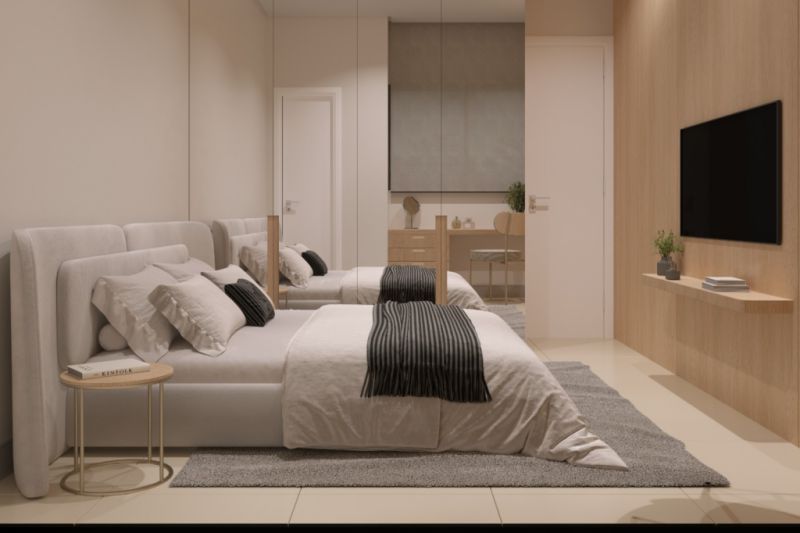 Cada unidade conta com 2 dormitórios, ambos suítes, garantindo mais privacidade e conforto para a rotina da família. Os ambientes foram planejados para serem funcionais e bem distribuídos, com área de serviço separada e espaços sociais que favorecem o uso no dia a dia.